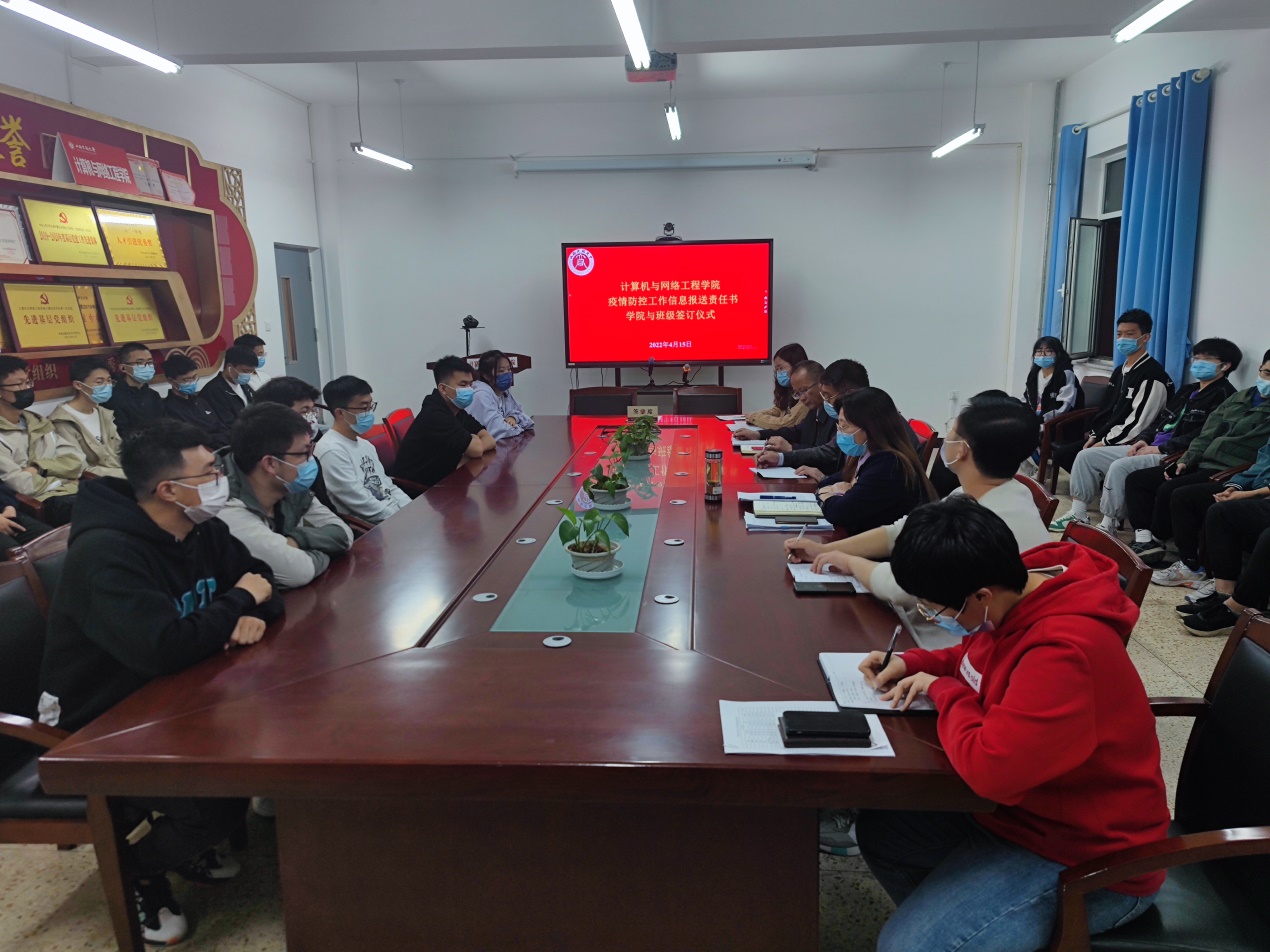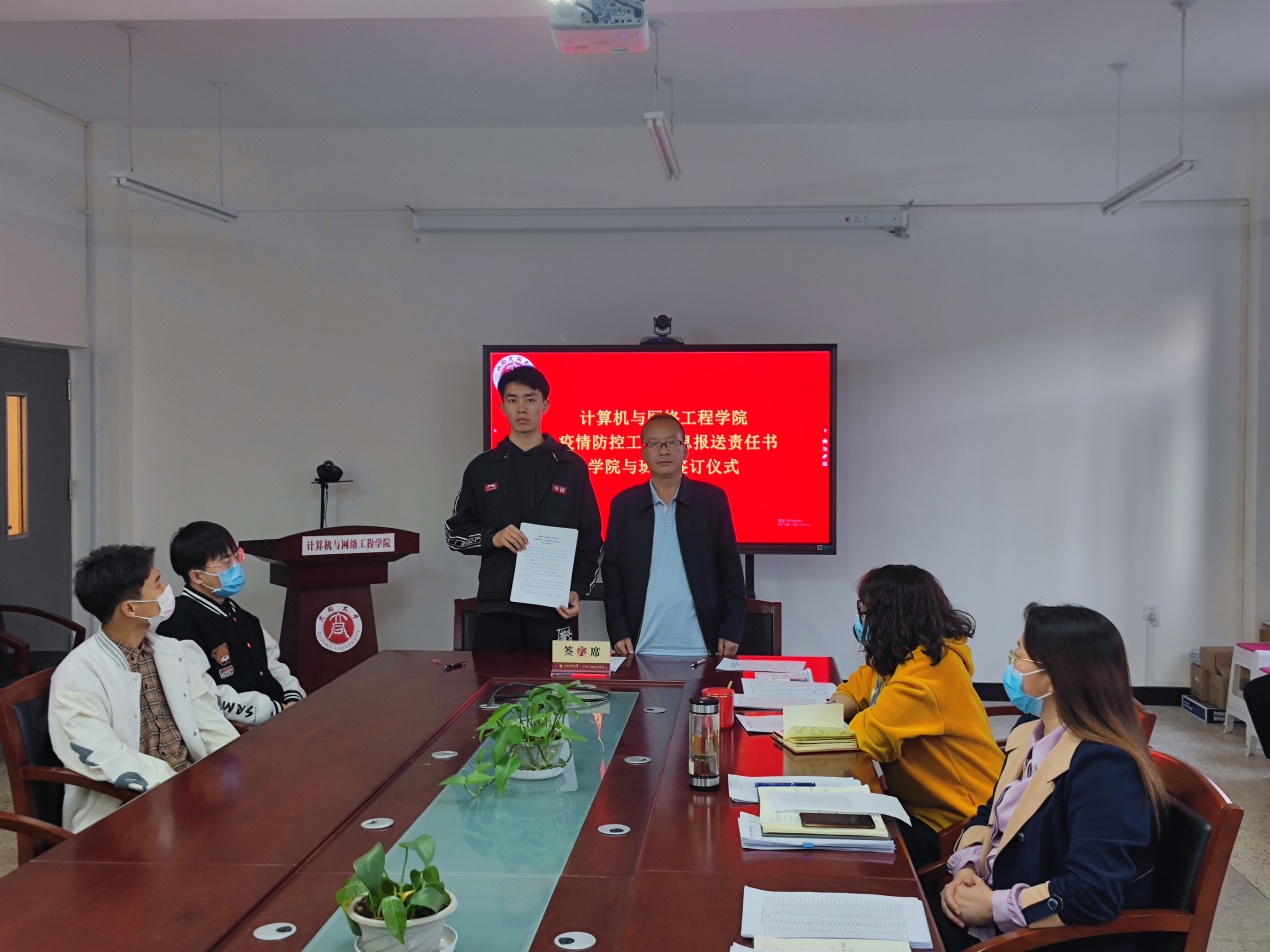 王永生肯定了我院在疫情防控工作中付出的努力,对我院专注学生成长成材、安全发展给予高度赞扬,对计网学子勇敢面对疫情、展示青年担当表示赞许。他表示,签约仪式彰显了现代大学文化,引导学生通过书面承诺的形式为自己的言行负责,建立法治思维,培养诚信意识。这不仅是对疫情防控报送信息的承诺,更是一场别开生面的法制宣传教育。