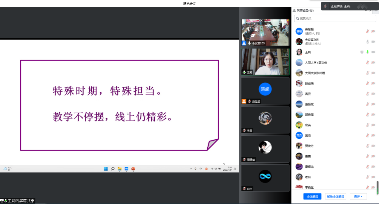 会上,教师代表结合自身所授课程,从教学准备、教学实施、教学心得方面依次分享校园封闭管理期间在线教学的经验与心得。内容涉及不同在线教学平台特点分析、学生课堂积极性调动、教学过程有效监督和教学评价合理反馈。杨宁老师介绍了“一屏三用”解决在线教学的板书书写难题,王莉老师讲到“特殊时期,特殊担当。教学不停摆,线上仍精彩”。
